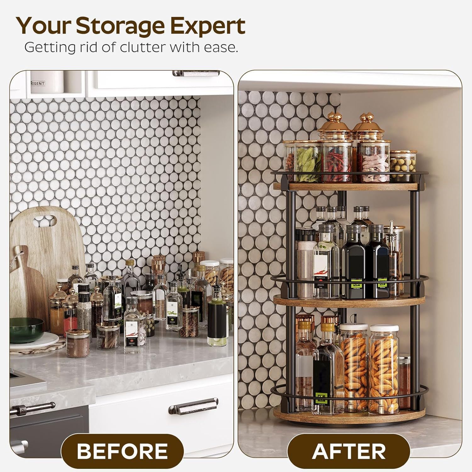 🔄 Full 360° Rotation - No more digging through cabinets! Smooth rotating access lets you see and reach everything instantly.
